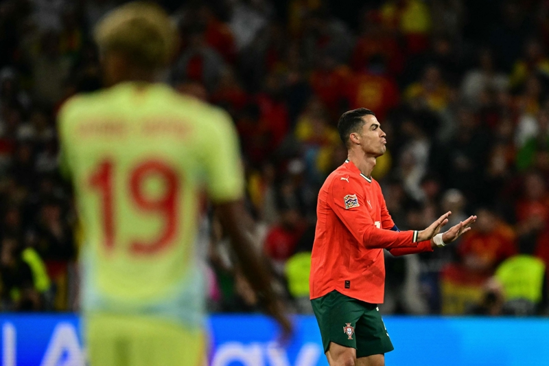 6月8日,葡萄牙队球员克里斯蒂亚诺·罗纳尔多(右)在西班牙队球员亚马尔身旁庆祝进球。\n 当日,在德国慕尼黑举行的欧国联A级联赛决赛中,葡萄牙队与西班牙队在常规时间和加时赛2比2战平,最终在点球大战中,葡萄牙队5比3击败对手,夺得冠军。\n 新华社/法新