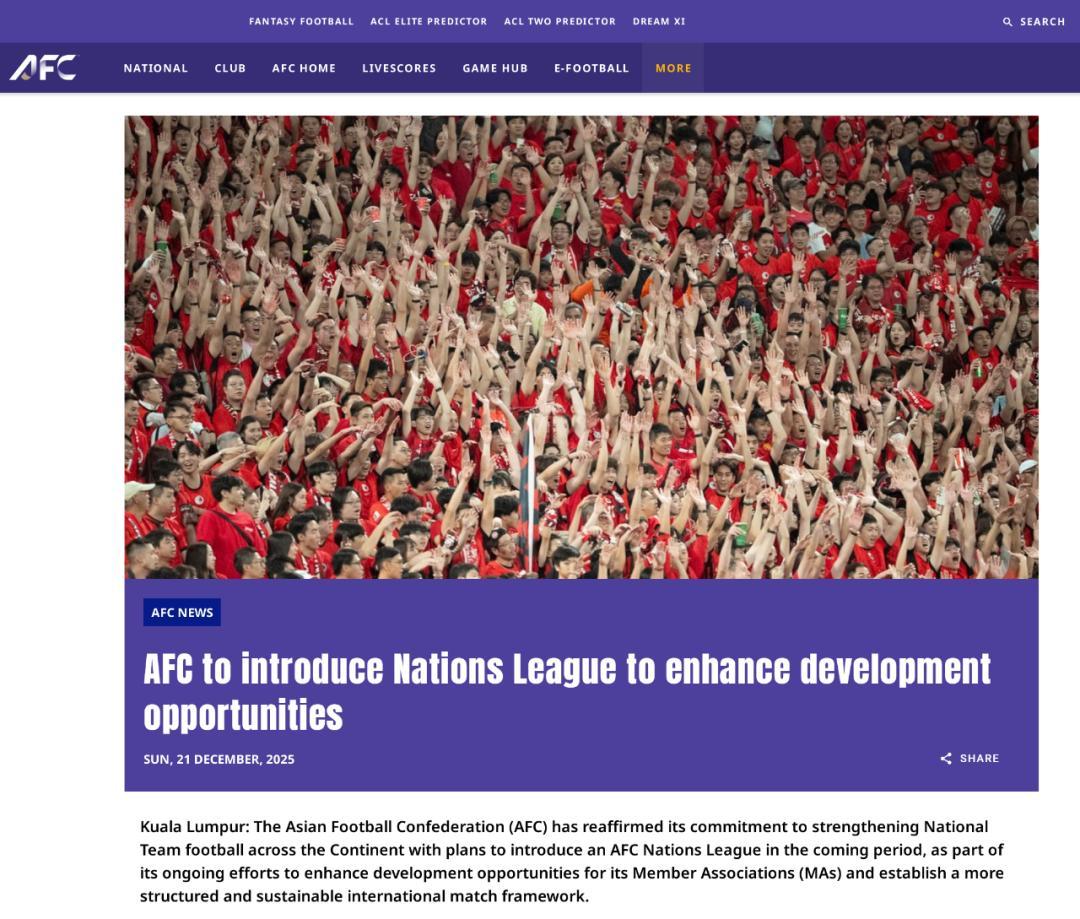 12 月 21 日,亚足联发布官方公告,宣布计划在近期推出亚足联国家联赛,旨在确保在国际比赛窗口期间,能够定期举办有意义的国际足球赛事。这个模仿欧国联的全新赛事,目前还处于酝酿阶段,赛事赛制、时间安排及实施细则等还有待最终敲定和落实。